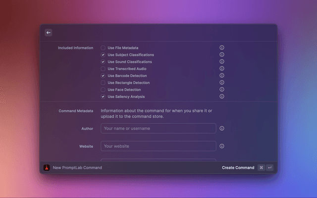 PromptLab allows you to create custom AI commands with prompts that utilize contextual placeholders such as {{selectedText}}, {{todayEvents}}, or {{currentApplication}} to vastly expand the capabilities of Raycast AI. PromptLab can also extract information from selected files, if you choose, so that it can tell you about the subjects in an image, summarize a PDF, and more.