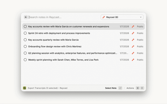 - Search Notes - View your notes in a list, see their details (including transcript), copy their links, or copy their contents as HTML or Markdown