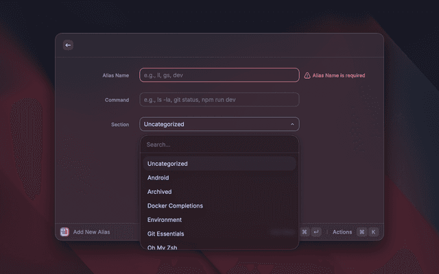 | 🖥️ | Alias Management | Browse, add, edit, and search aliases organized by sections with full validation |
