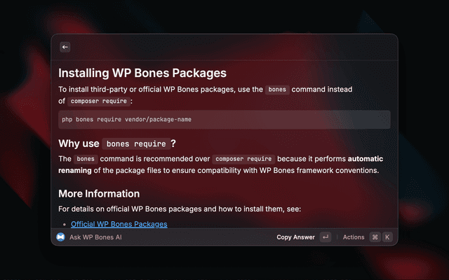 This mod provides several commands centered around managing the WP Bones WordPress plugin framework. It provides quite a few commands for varying uses, so there should be something for everyone! Take a look at the scenarios below to get a feel for how you might use the extension.