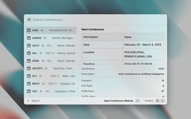 CCF-DDL is a collaborative repository for renowned CCF conferences. This extension allows you to search for conferences in CCF-DDL and open them in your browser.