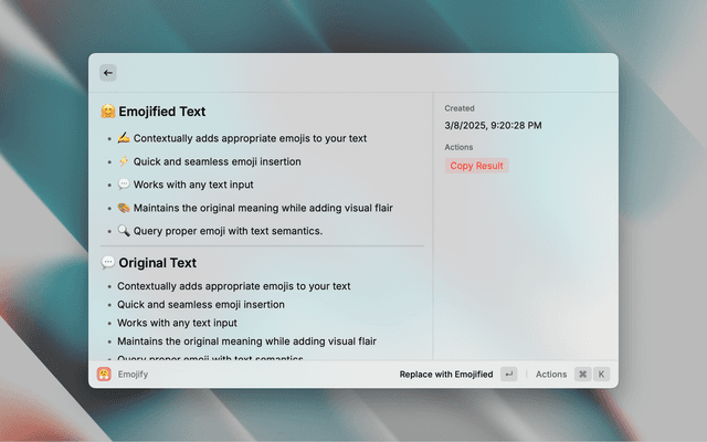 A Raycast extension that intelligently adds relevant emojis to your text to make it more expressive and engaging! ✨