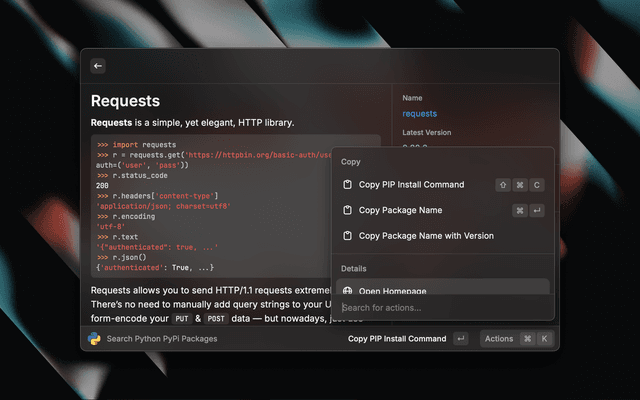• PyPI API returns the package description in form of GitHub flavored markdown, but raycast renders common markdown only, so we can write a function to convert GFM to CM (as much as possible).