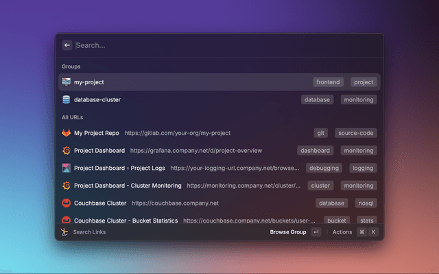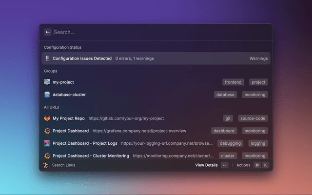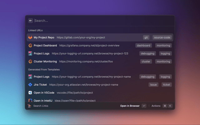 Quick Jump is a Raycast extension designed to give you and your team quick, organized access to all your essential project links. With Quick Jump, you can build a config file for your Git repositories, dashboards, databases, and internal tools, accessible with just a few keystrokes.