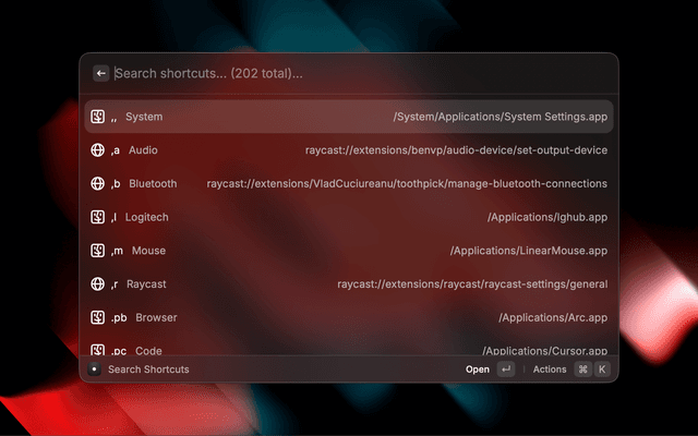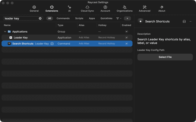 Search and trigger Leader Key shortcuts by alias, label, or value.