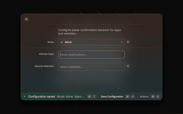 It adds context-aware confirmation before pasting, based on the frontmost app and (when available) active browser website.