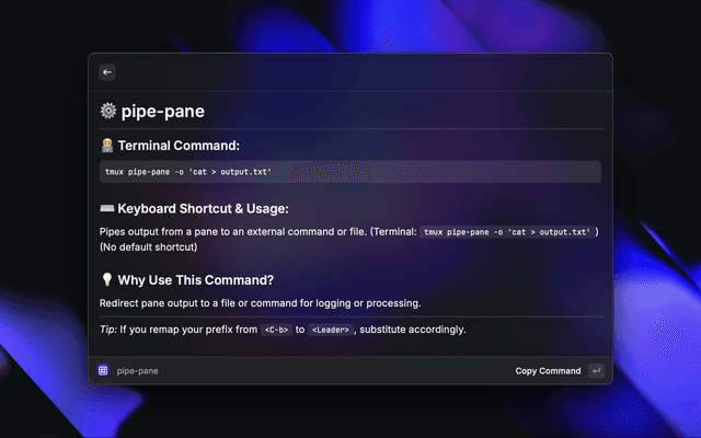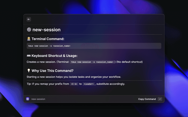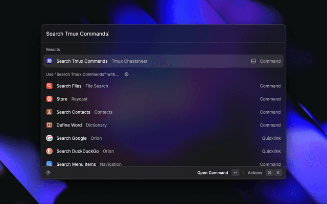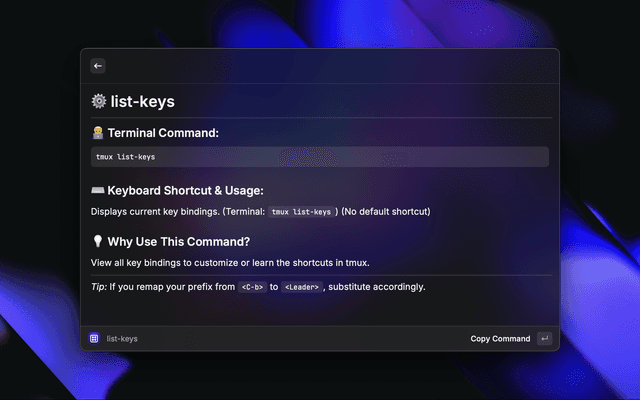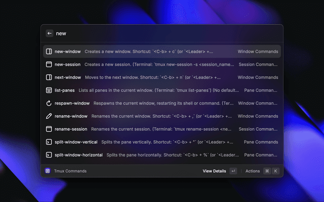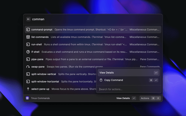 Tmux Command Lookup is a Raycast extension built with TypeScript and React that provides a comprehensive, searchable cheatsheet for tmux commands. The extension groups commands by category (e.g., Session Commands, Window Commands, Pane Commands, etc.) and displays detailed information about each command, including the terminal syntax and default keyboard shortcuts.