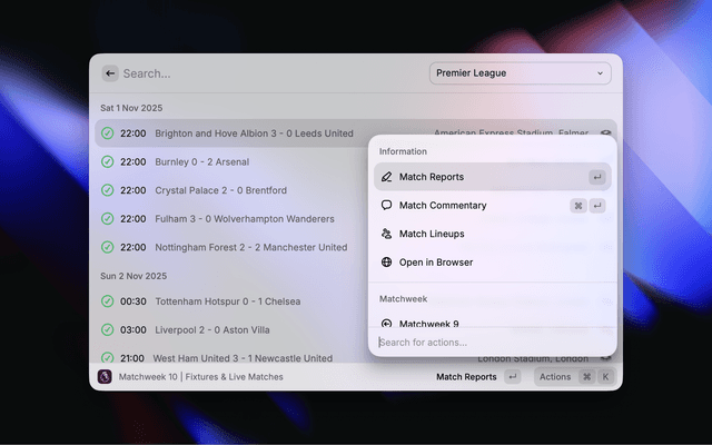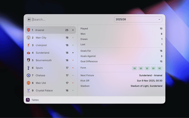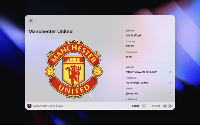 Get instant access to Premier League data right from your Raycast menu. Easily search for teams, players, fixtures, results, standings and awards.