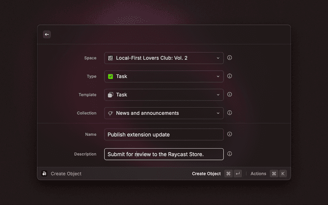 Create new objects in your spaces directly from Raycast.