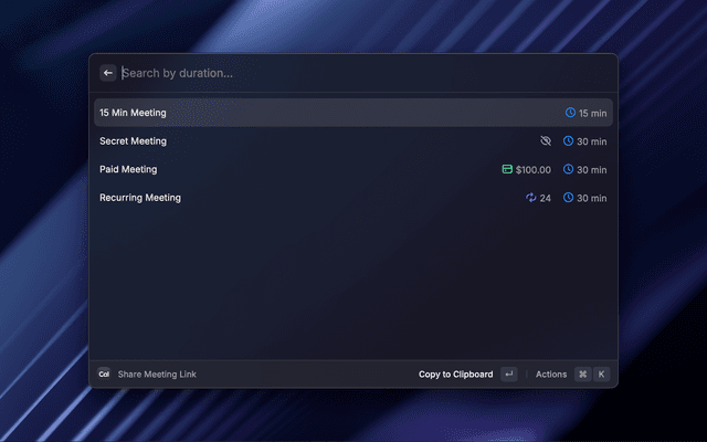 Quickly share your Cal.com meeting links, generate private links, view and cancel bookings.