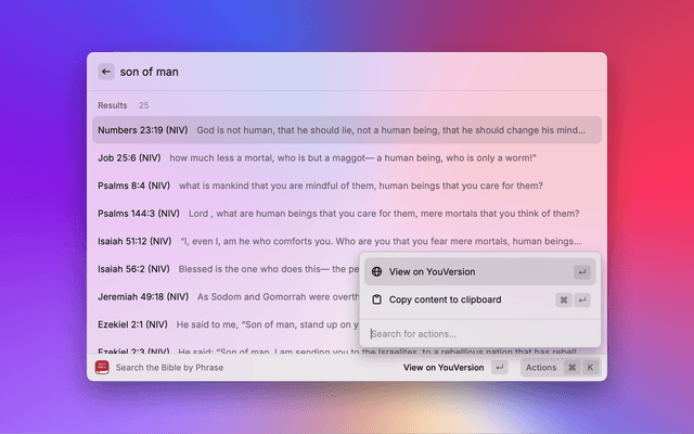 This Raycast extension allows you to search the YouVersion Bible quickly and easily. You can:
