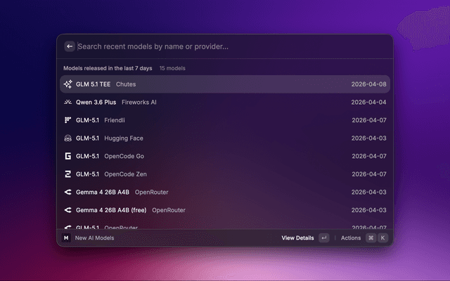 Browse models released recently. Defaults to the last 7 days; adjust the window via the lookbackPeriod preference (days) in Extension Preferences.