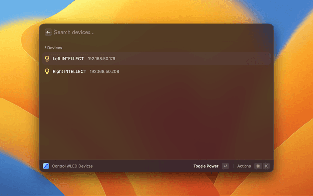 Control your WLED LED strip devices directly from Raycast. Manage multiple devices, adjust colors, brightness, and apply effects with a simple, unified interface.