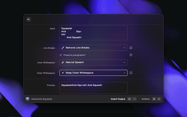 Text from external sources often comes with unwanted formatting: broken line breaks, excessive spacing, or awkward hyphenation. Squeeze helps you quickly clean it up with a few preset commands.