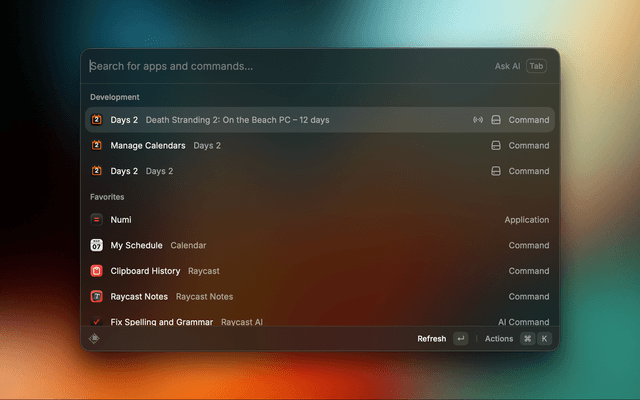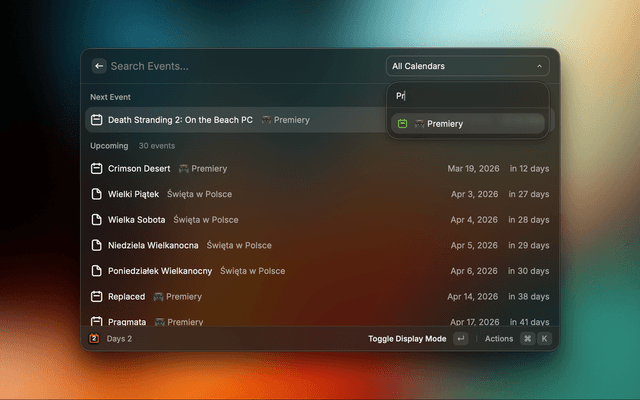 • Background refresh — automatically updates a subtitle in Raycast root search showing the nearest event (e.g. "Birthday – 12 days"), refreshes every hour