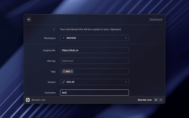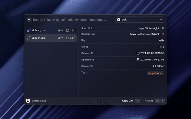 This extension allows you to shorten and retrieve your Dub links directly inside Raycast.