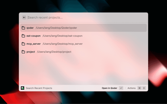 • Search Recent Projects - Quickly search and open your recently accessed Qoder projects