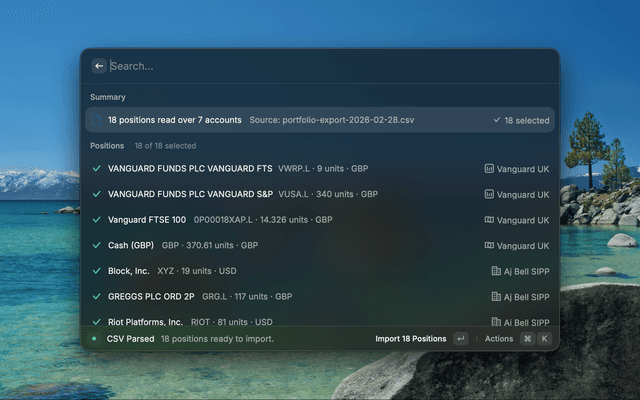 | Portfolio Tracker | View your portfolio, manage accounts and positions, track net worth. Import/Export via CSV is available from the action menu (⌘⇧I). |