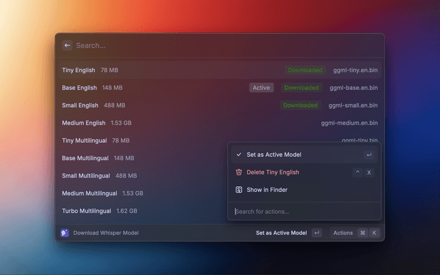 brew install whisper-cppDownload Whisper Model extension command. This will configure the model's path automatically.ggml-{model}.bin) and point the extension to it's path in preferences.sox: This extension uses the SoX (Sound eXchange) utility for audio recording.