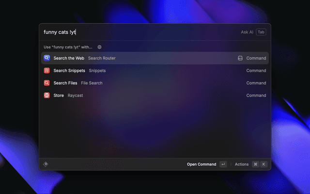 Pro Tip: ✨ For the best experience, set up Search Router as a Fallback Command in Raycast. This allows you to use bangs directly from the main Raycast search without having to first open the extension!