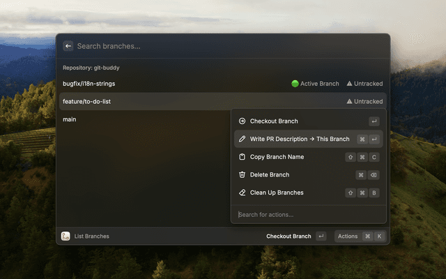 An opinionated, AI-powered Git assistant for commit messages, PR descriptions, and branch management tasks. You can configure the repository path, base branch, and AI model for generating content.