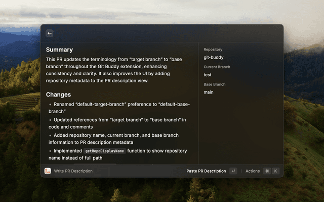 • Write a PR description for a selected branch.