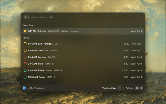 Cmd+E to add/remove cities← / → to shift time by your configured Arrow Key Scrub MinutesOption+← / Option+→ to shift by your configured Option+Arrow Key Scrub MinutesCmd+N to reset to current time| Shortcut | Action |