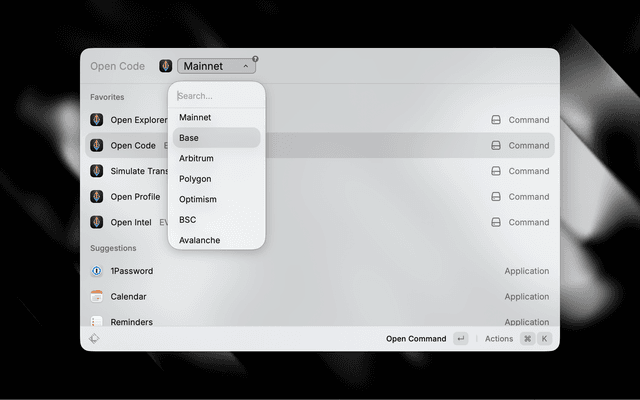 A Raycast extension for EVM power users. Copy an address, transaction hash, or block number into your clipboard and instantly open block explorers, read contract source code, check portfolio balances, look up wallet analytics, or simulate transactions across 24+ networks.