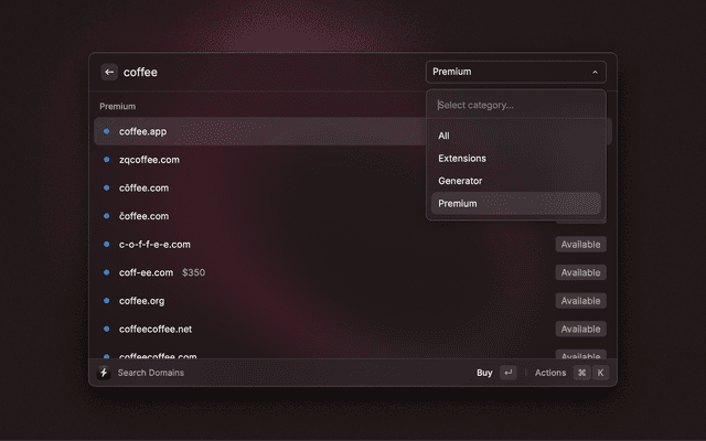 The fastest domain name search tool on the internet, now available as a Raycast extension. Search for available domain names instantly with real-time results powered by instantdomainsearch.com.