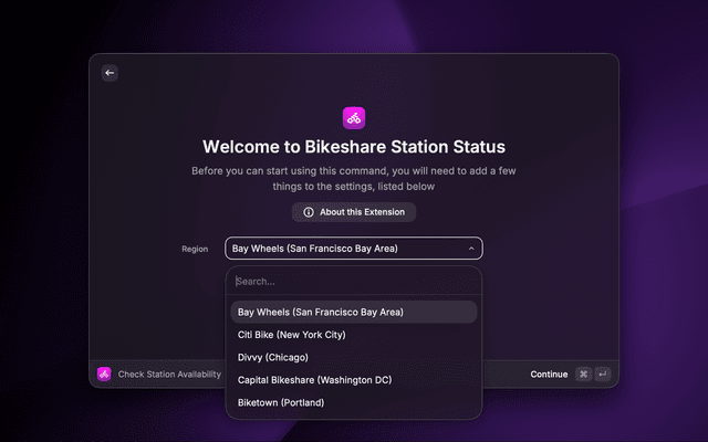 Check bike availability at bikeshare stations run by Lyft. You will be prompted to select a region on first run.