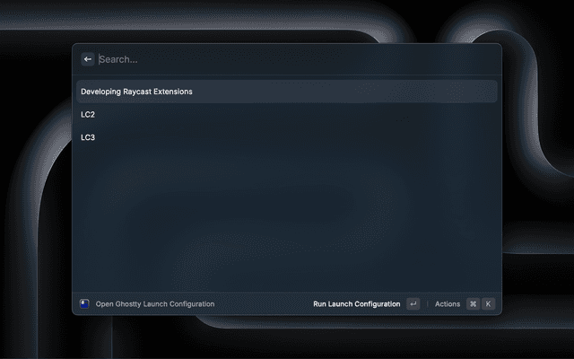 title, the extension uses the last folder name from its effective directory. For example, ~/Developer/slabware/app-fabricator becomes app-fabricator.commands are run by Ghostty as pasted input followed by Enter.commands if you just want an interactive shell in that directory.The Open Workspace from Git Repos command can reuse your saved launch configurations for any repository it finds.