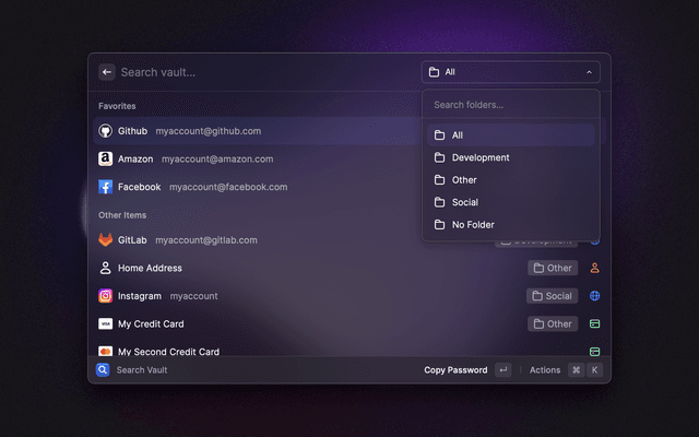 🔎 Search your vault 📋 Copy and paste any field 🔑 Generate passwords and TOTP codes ⭐ Mark items as favorites