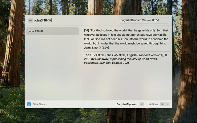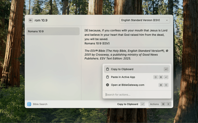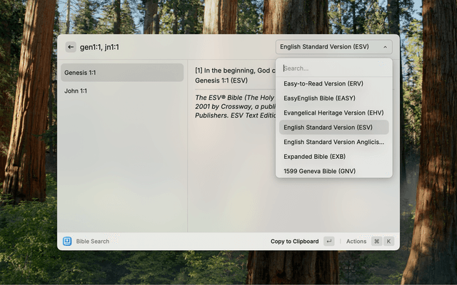 Search for, display, copy and paste bible passages. Configure whether to include verse numbers or show one verse per line.