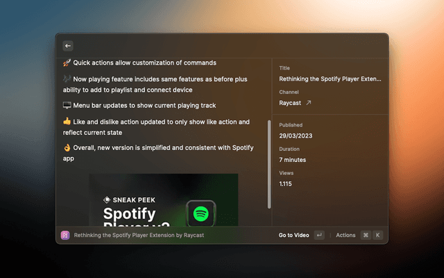 Summarize any YouTube Video with AI and ask follow up questions to get all the details. Choose between Raycast, OpenAI ChatGPT or Anthropic Claude. You have to either be a Raycast Pro Member, have access to an OpenAI API Key or Anthropic API Key to use this extension. Alternatively, you can use the extension with Ollama to summarize YouTube videos using a local LLM.