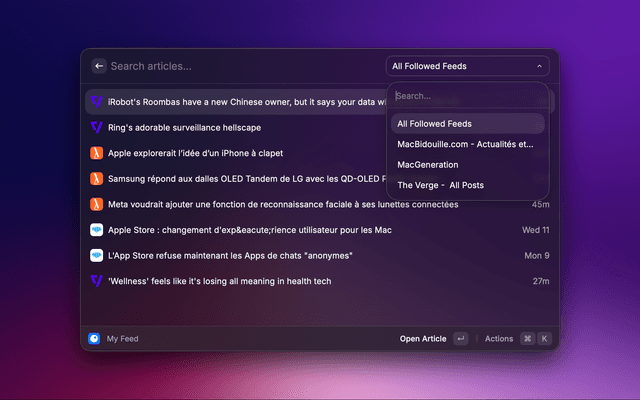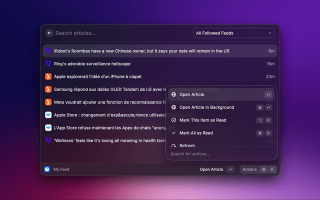 • My Feed (Articles command): browse feed articles with fast keyboard actions.