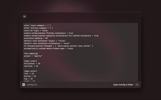 aerospace config --config-path)Aerospace to view the available commandsAerospace Shortcuts command to view all shortcuts parsed from your config fileAerospace Configuration command to view your Aerospace configurationAerospace Menubar Shortcuts command to enable menubar shortcutsAerospace Switch Apps command to show the app in current workspaceThe extension supports programmatic access via Raycast deeplinks using launchContext. This allows integration with window tile manager tools like SketchyBar, Alfred, Keyboard Maestro, or custom scripts.