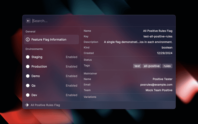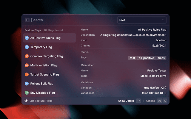 • 🏷️ View flag details including variations, targeting rules, and prerequisites
