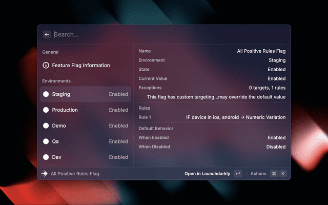 Quickly access and manage your LaunchDarkly feature flags directly from Raycast. View flag details, environments, and targeting rules without leaving your keyboard.