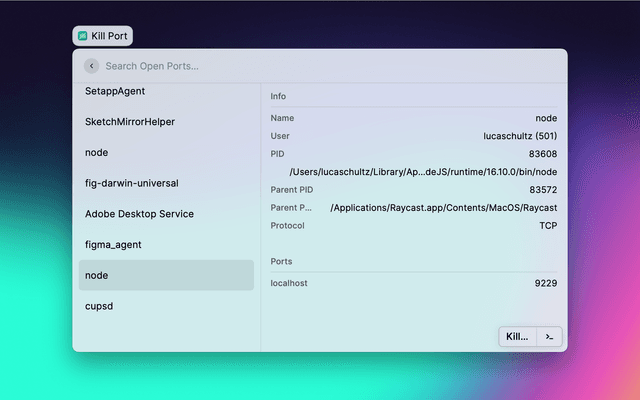 List open ports in Raycast and the menu bar, and kill the processes associated with these ports. Choose between two termination signals: the default SIGTERM