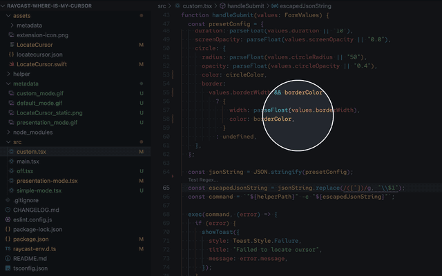 For the curious minds, this extension uses a small, pre-compiled Swift application located in the extension's assets. This app is responsible for creating the visual effects on the screen. The source code for this helper app is available in the assets/LocateCursor.swift