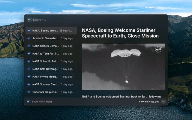 This Raycast extension allows you to view the Astronomy Picture of the Day, latest news, astronauts, spacecrafts, and upcoming launches from NASA and other space agencies.