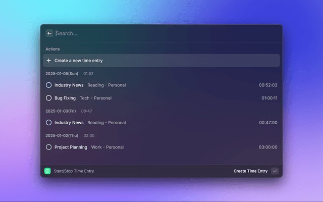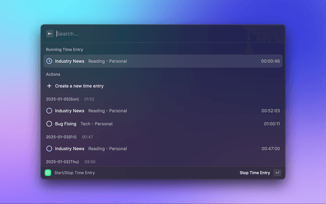 1. By pressing "Enter" on a time entry, you can start/stop the time entry.