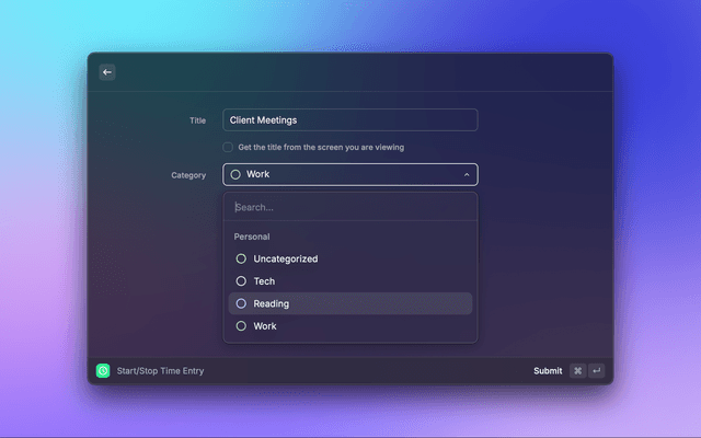 2. You can start a new time entry by selecting "Create a new time entry" and inputting a title and category. Additionally, it's possible to automatically fetch the title from the page you are currently viewing.