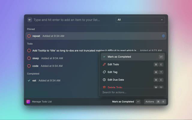 An extension for creating and managing a todo list. Create and delete items, mark tasks as completed and pin important items.