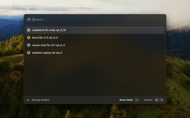 Ollama installed and running on your mac. At least one model need to be installed throw Ollama cli tools or with 'Manage Models' Command. You can find all available model here.