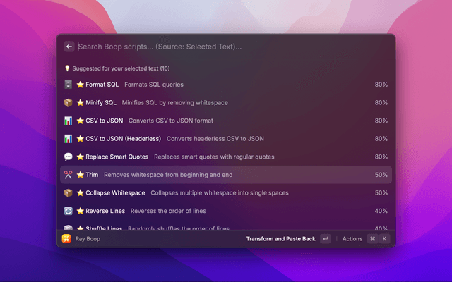 Select Text in an editor and run Ray Boop to select a text transform and paste directly back into your text document or Shift + Enter to copy to clipboard.