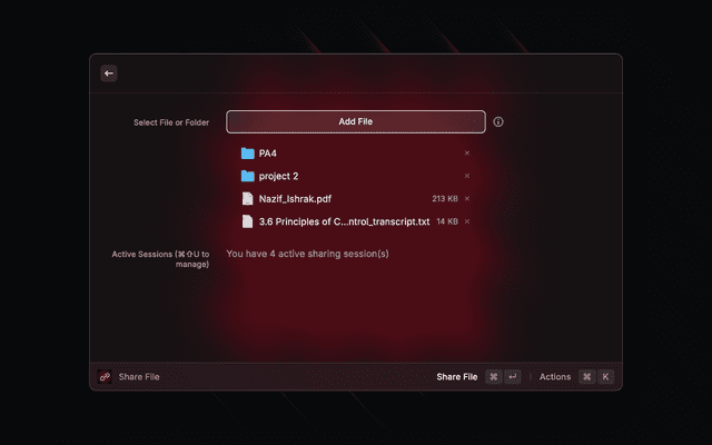 Sendme brings effortless file sharing to your Raycast environment, allowing you to share files peer-to-peer without any servers, accounts, or configuration.