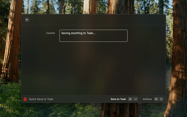 Quick Save: Save text or URLs to Teak without context switching.Search Cards: Search across Teak card content, tags, and metadata.Favorites: Open and copy from your favorited cards.https://app.teakvault.com/settingsapp.teakvault.com and Convex endpoints.