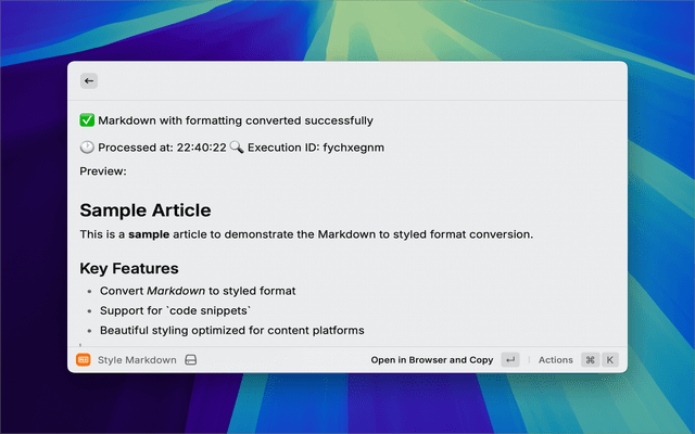 A Raycast extension that converts Markdown text to styled HTML with inline CSS, ready for direct copy-paste into content editors and platforms.