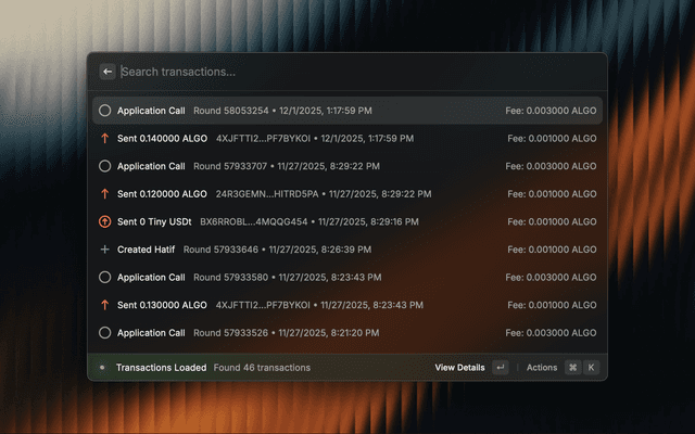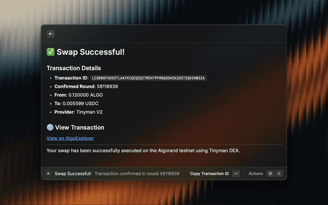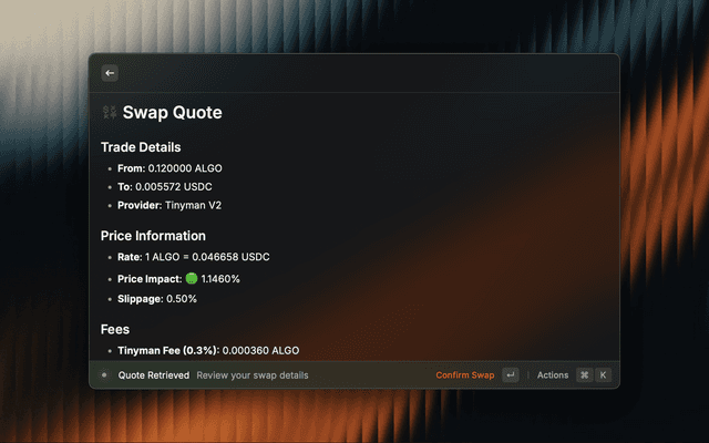 A powerful Raycast extension that brings the full capabilities of the Algorand blockchain directly to your macOS toolbar. Manage wallets, send transactions, swap assets, and more - all without leaving your workflow.
